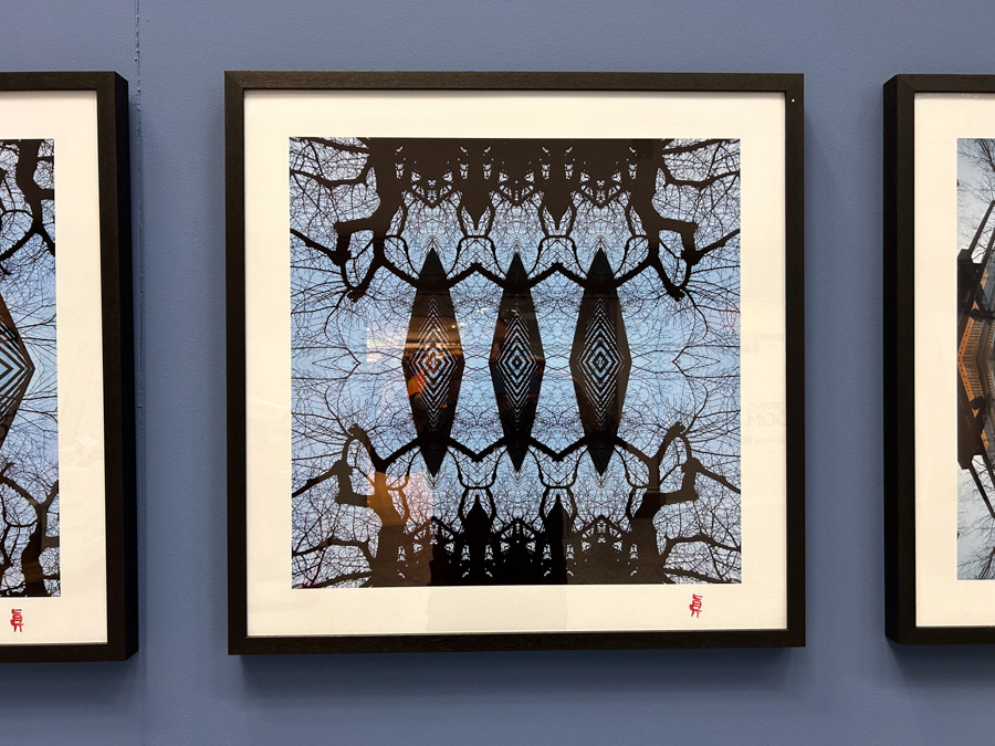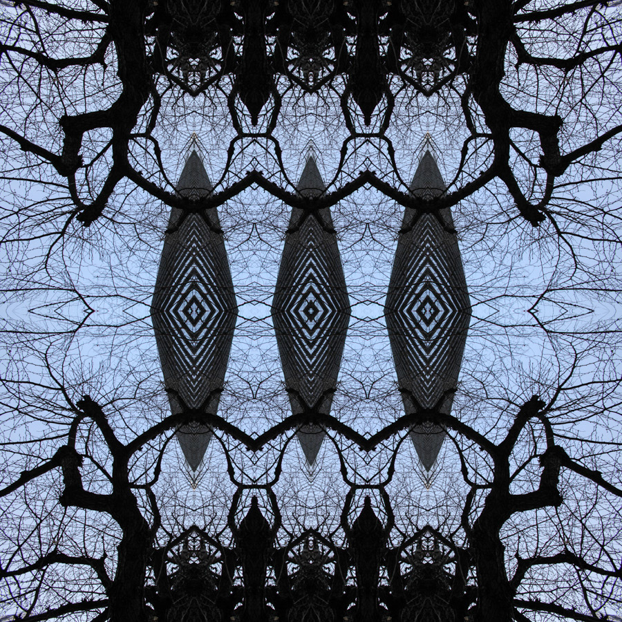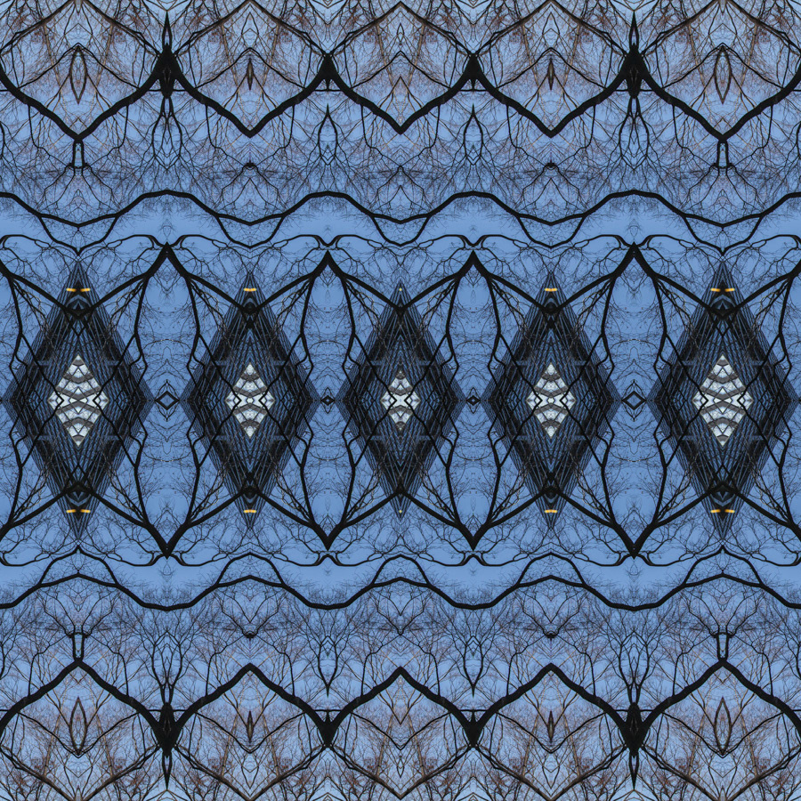 We might be on the set of one of those futuristic films that depict the colonization of parallel universes by alien intelligences, or—with a little less science fiction and a little more science—discover that Virginio is showing us reality through one of those transparent organic-electronics microchips that map neural networks through electrical and luminous signals. But the trick, like the die, is soon cast, and the supposed brain connections reveal themselves to be “nothing more” than reflected architectures among the bare branches of cherry trees photographed from below in winter. And yet, even with the trick revealed, we continue to believe it. It is like stepping into the hall of mirrors at a funfair, where nothing is as it seems.